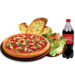 INCLUDES:One Regular Pizza ( Flavor as your Choice )Four pcs Garlic Bread1.5 ltr Drink ( Flavor as your Choice )..